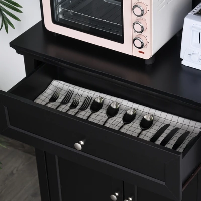 - Ample Storage: This kitchen cabinet features two double-door cabinets, a central drawer and a large compartment, which constitute multiple cabinet storage spaces. Perfect for storing dishes, cutleries, knick-knacks, or other household items that you want to be accessible while still hidden away.