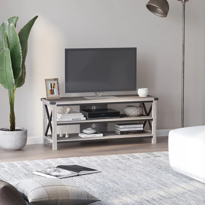 - HIGH-QUALITY MATERIAL: Made of P2 grade particleboard and MDF board, quality material ensures high stability of wooden TV stand, providing great load capacity up to 110lbs. With a side X-Bar for added support, this media center will be promised a stable standing.