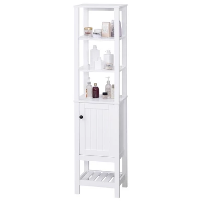 This HOMCOM bathroom cabinet is designed to blend in any modern bathroom. Its space-saving design is ideal for a small bathroom where space is limited and it provides enough storage space for toilet paper and other bathrooms items. The cabinet with a door will effectively prevent your items from getting wet. Wood construction and simple white color make this storage piece sturdy and attractive.